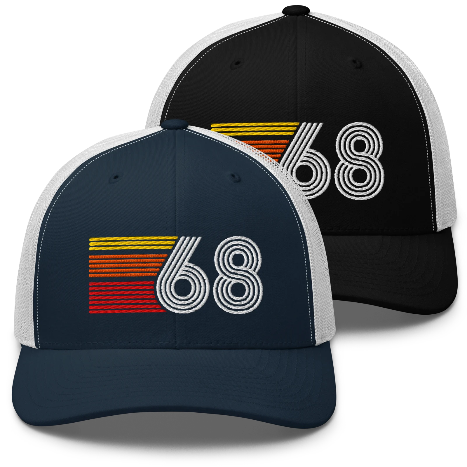 1968 retro trucker hat with a classic embroidered yellow orange red lines design. Great birthday hat for all born in ’68!