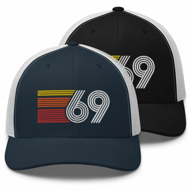 1969 trucker hat with a classic retro yellow orange red lines design. Great birthday gift for those born in ’69!