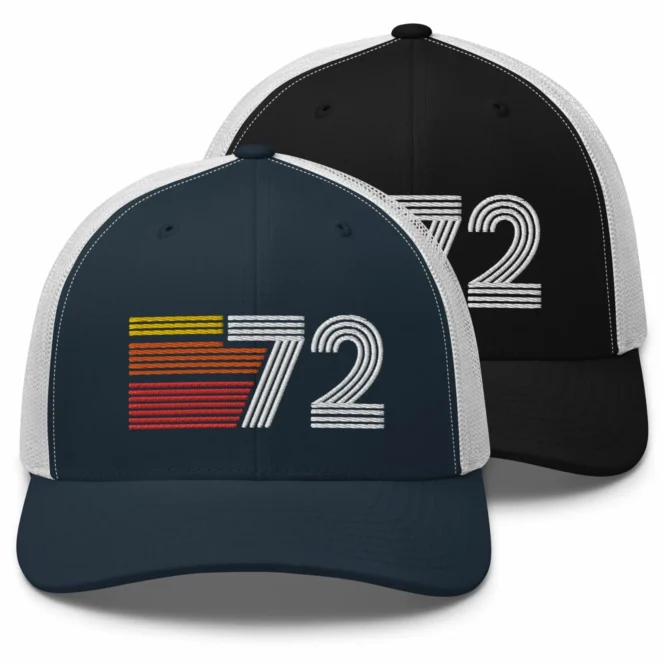1972 retro trucker hat with yellow orange & red lines design. Great birthday gift for those born in ’72.