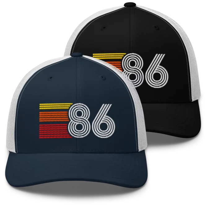 Retro snapback trucker hat with throwback yellow orange red stripes design and the number 86 embroidered design. Great birthday gift for those born in 1986 celebrating the big 40th birthday!