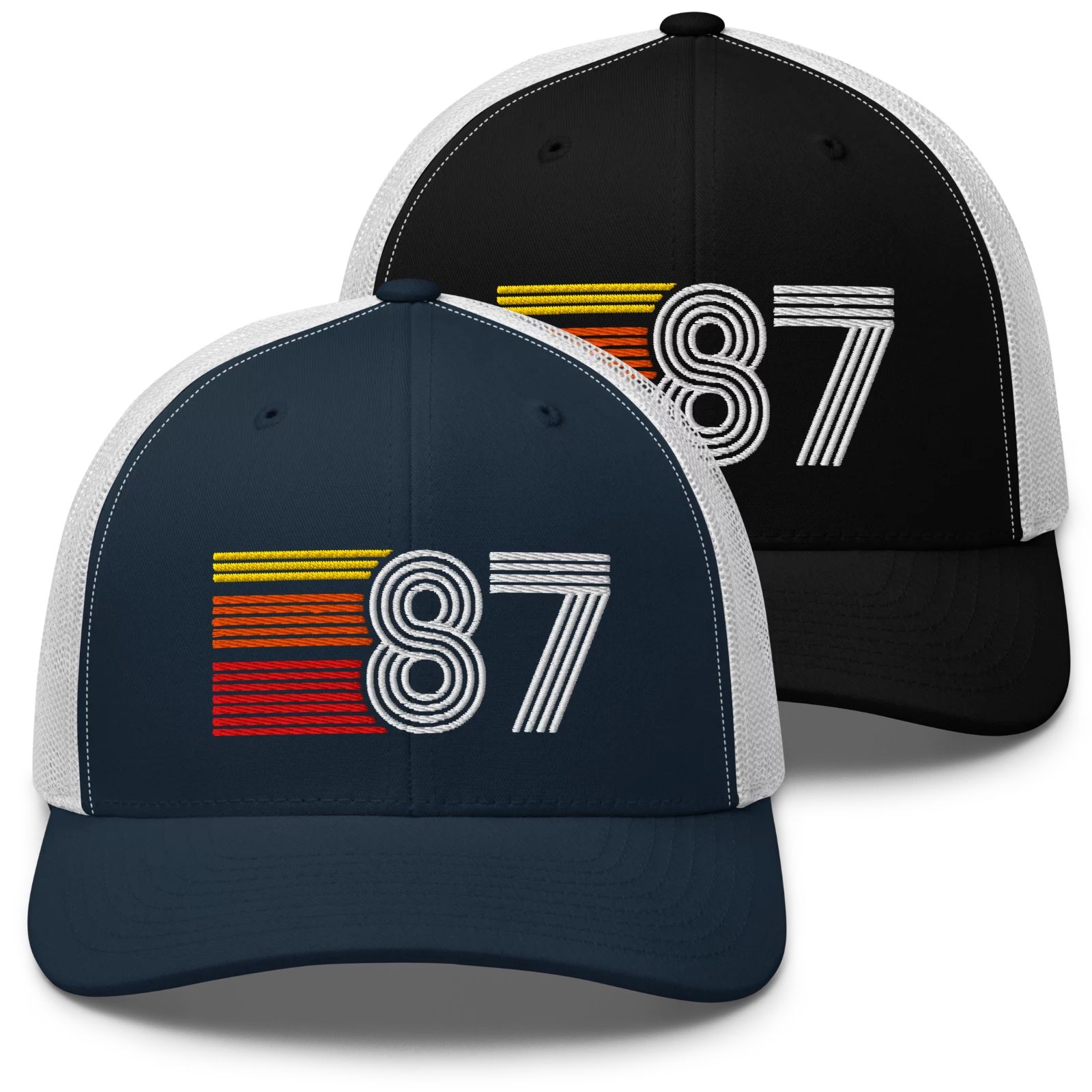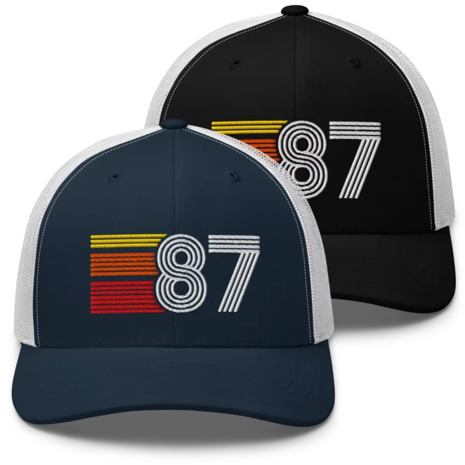 Retro snapback trucker hat with classic yellow orange red stripes and number 87 embroidered design. Great birthday gift or party hat for all born in 1987.