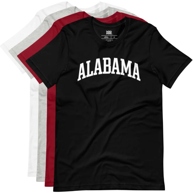 Sweet Home Alabama pride in a bold arched block letter design. Printed direct-to-garment on a soft, comfortable t-shirt.