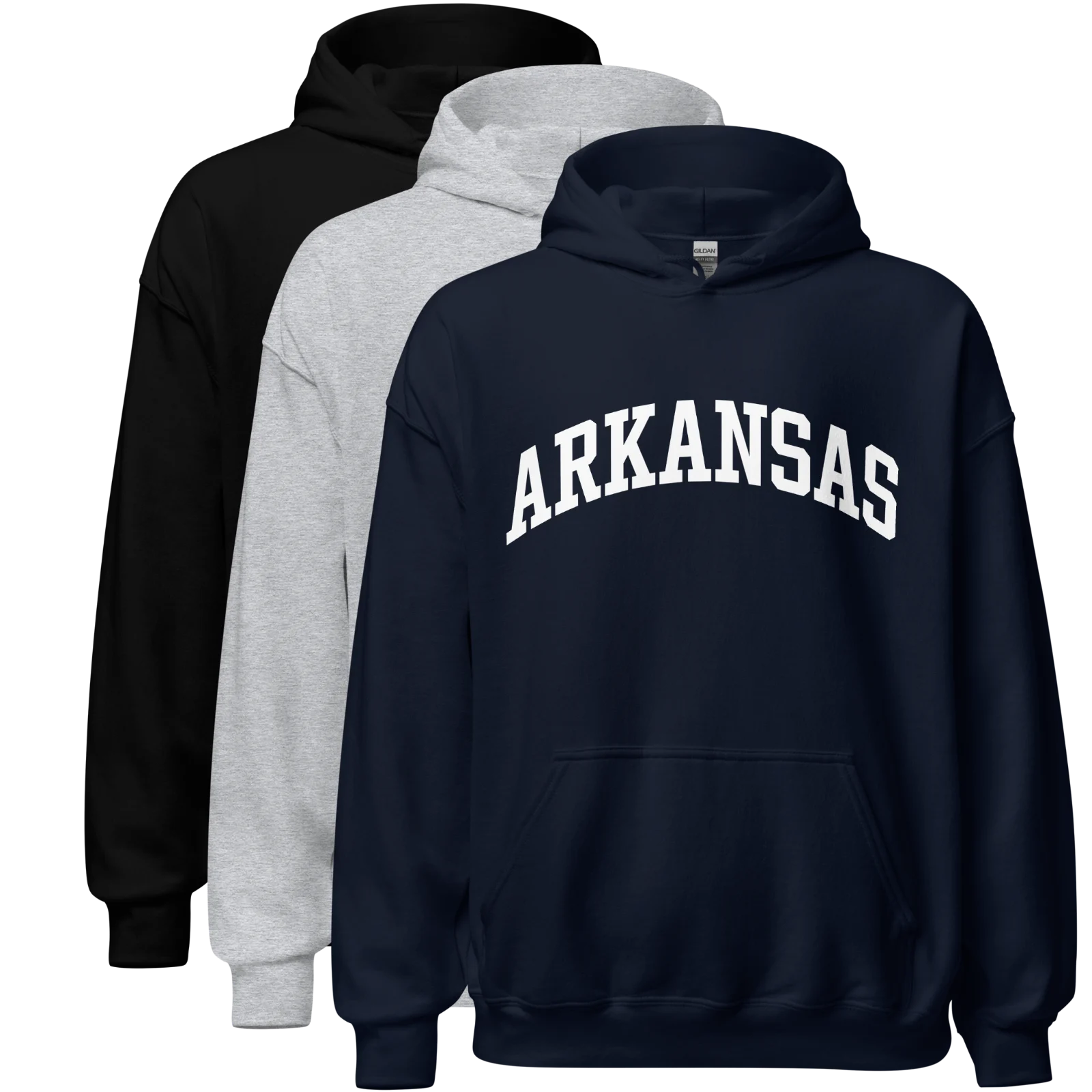 Natural State pride, kept simple. Clean arched lettering made for Arkansas. Available in black, navy, or heather gray.
