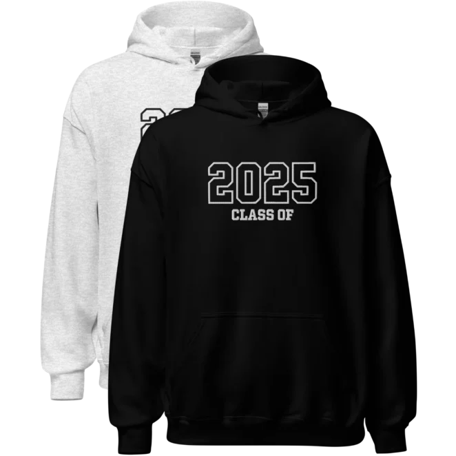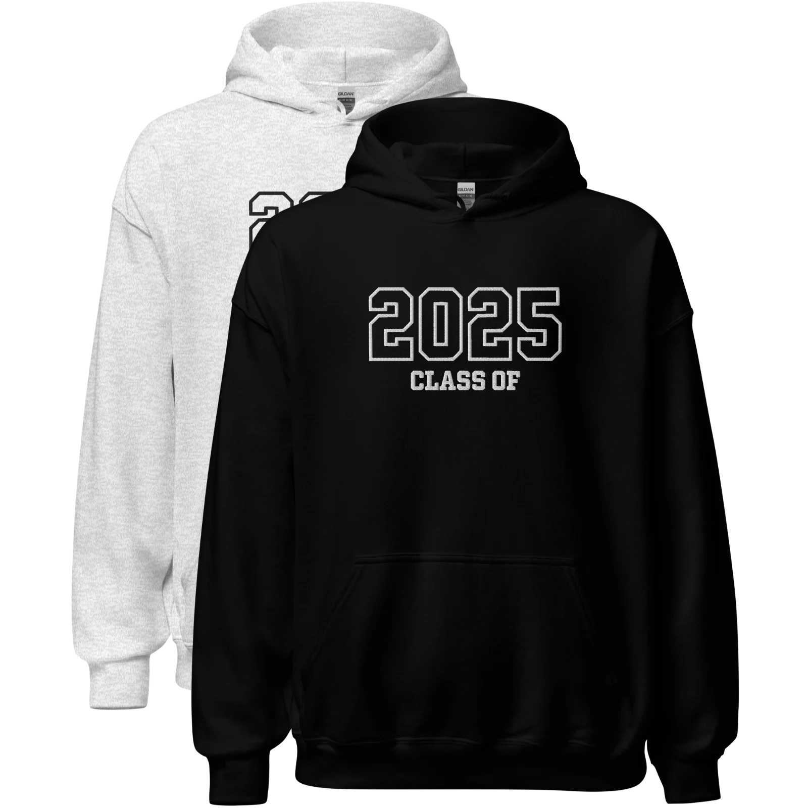Comfy, cozy embroidered CLASS OF XXXX (enter your year) hoodie with classic block numbers/letters.