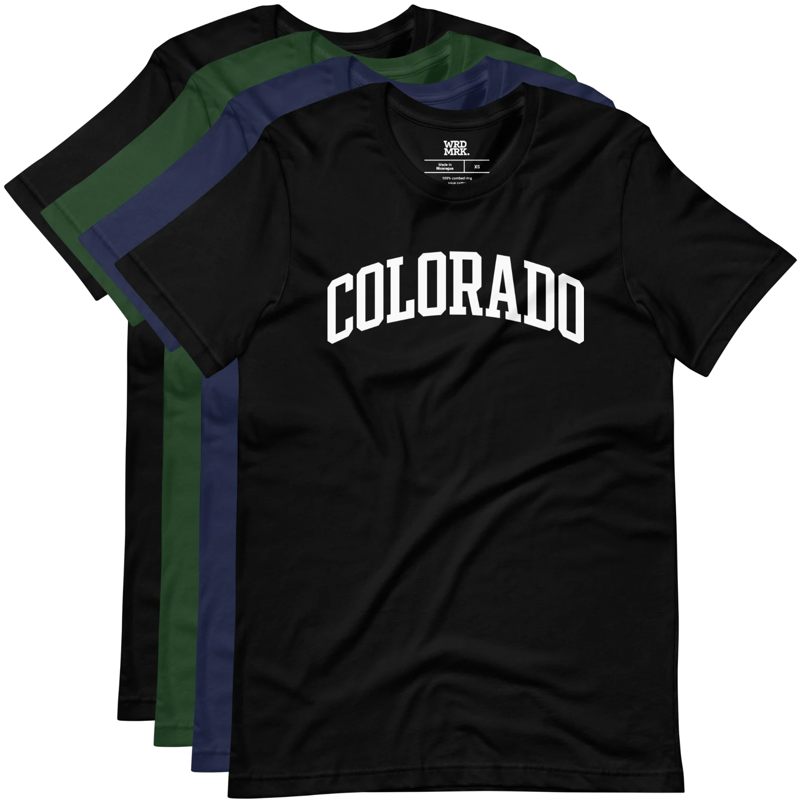 Rocky Mountain state pride in a bold arched block letter Colorado design. Printed direct-to-garment on a soft, comfortable t-shirt.