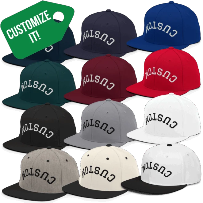 Upside down snapback hat with your custom text. Choose from 12 hat color options and 15 thread colors.