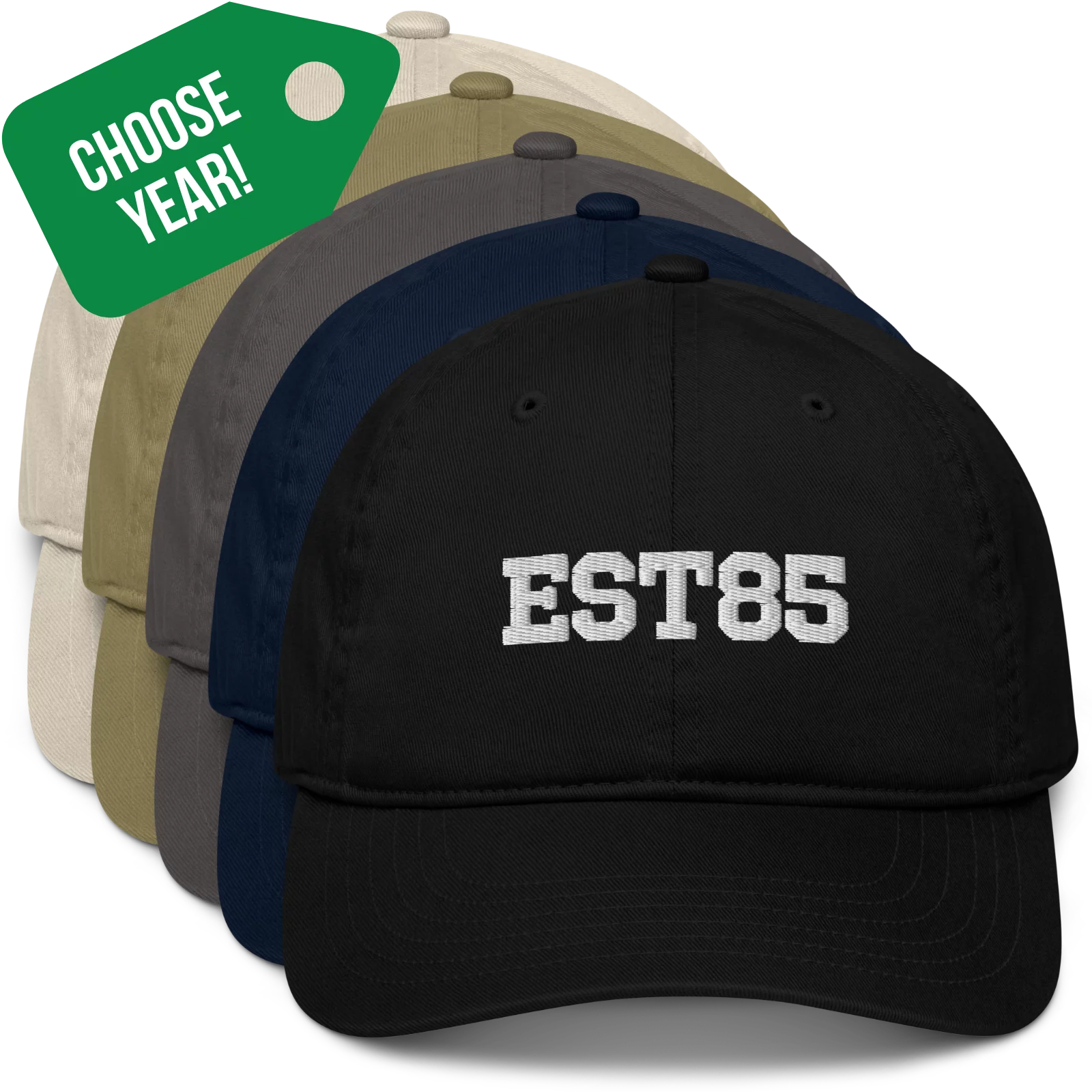Classic ESTYR (Established Year) baseball hat: select your color, type your two-digit year, then sail off into the sunset in conscious style.