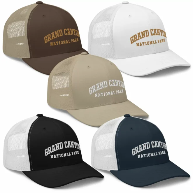 Grand Canyon National Park snapback trucker hat featuring an embroidered retro type design. Protect your head and face in style on your next Grand Canyon trip.
