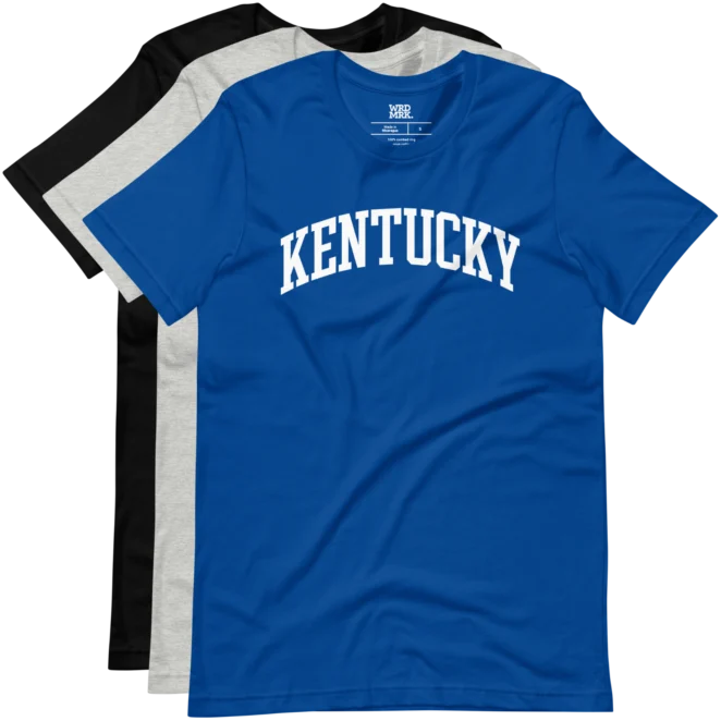 Bluegrass State pride in a clean arched block letter Kentucky design. Printed direct-to-garment on a soft, comfortable t-shirt.