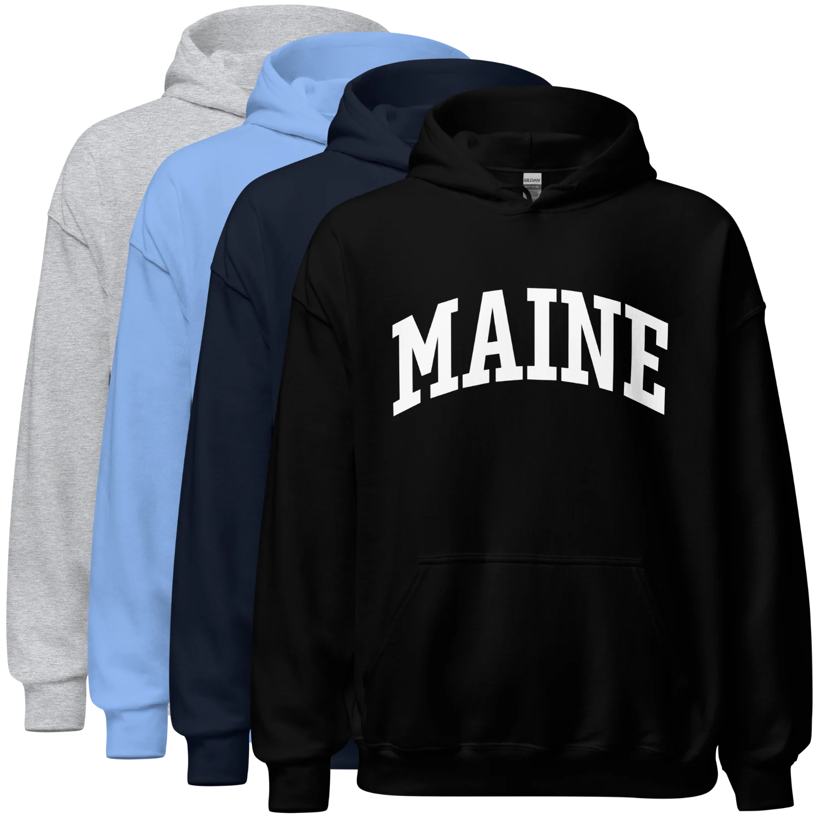 Timeless Maine hoodie with arched block letters and a little Down East spirit built in.