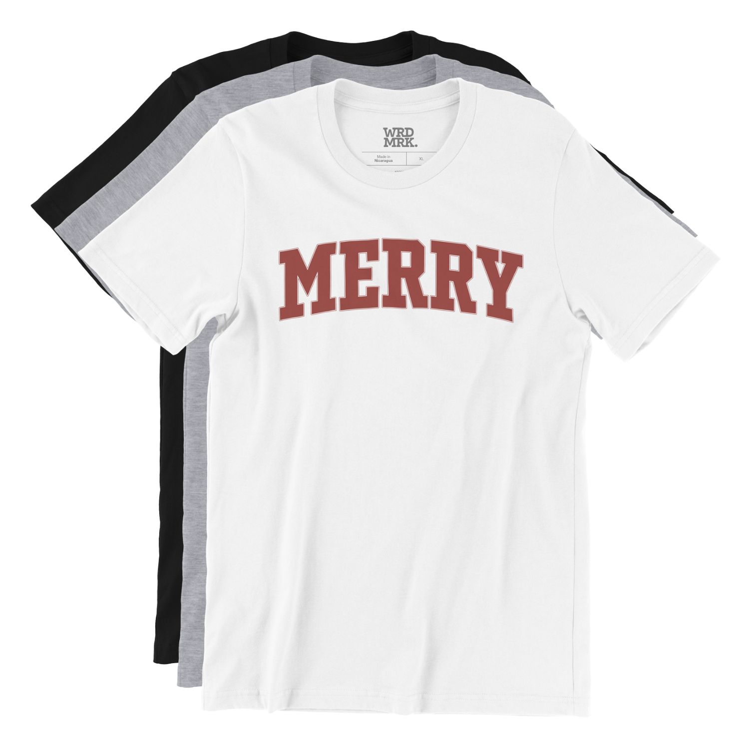 Retro unisex shirt with off-red MERRY College/University style printed word design.