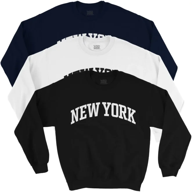 Represent New York in the aesthetic college style sweatshirt. Crewneck pullover with a curved retro graphic print across the front.