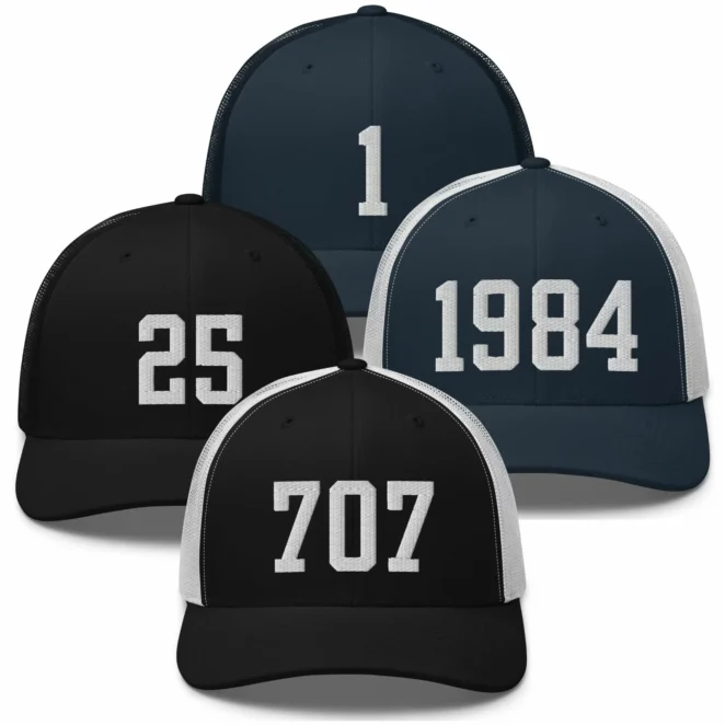 Type any number up to 5 digits for a personalized classic embroidered trucker hat that will be a go to.