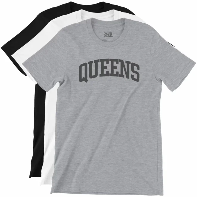 The Queens college-style tee featuring a bold, curved printed graphic text design.