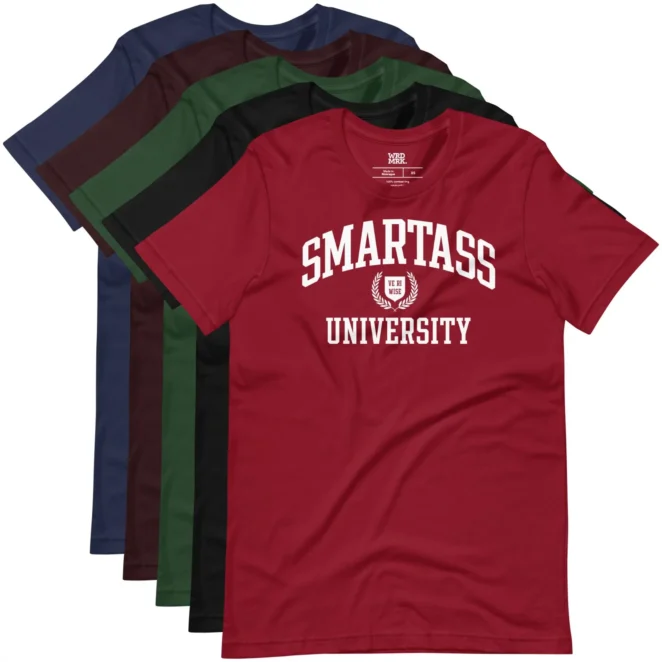 Enroll in Smartass University, where sarcasm is the only major. This t-shirt is the official uniform, so grab yours today!