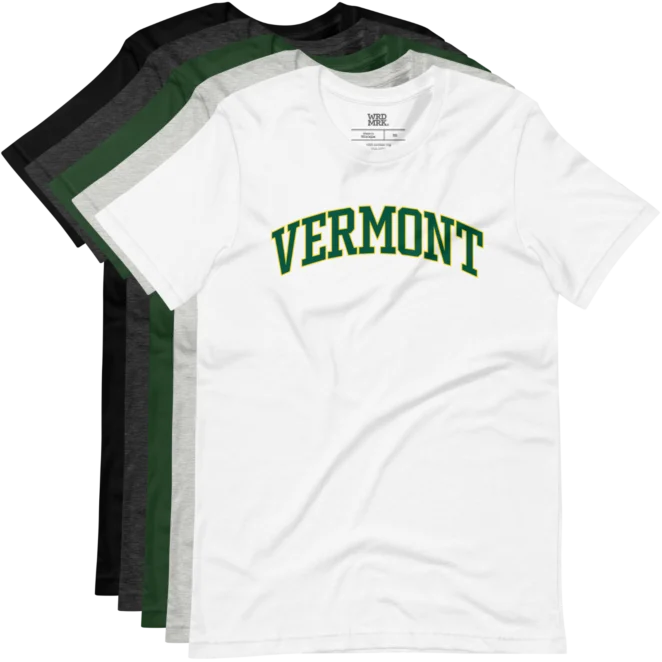 Timeless Vermont design featuring arched block letter typography. Printed direct-to-garment on a soft, comfortable t-shirt.