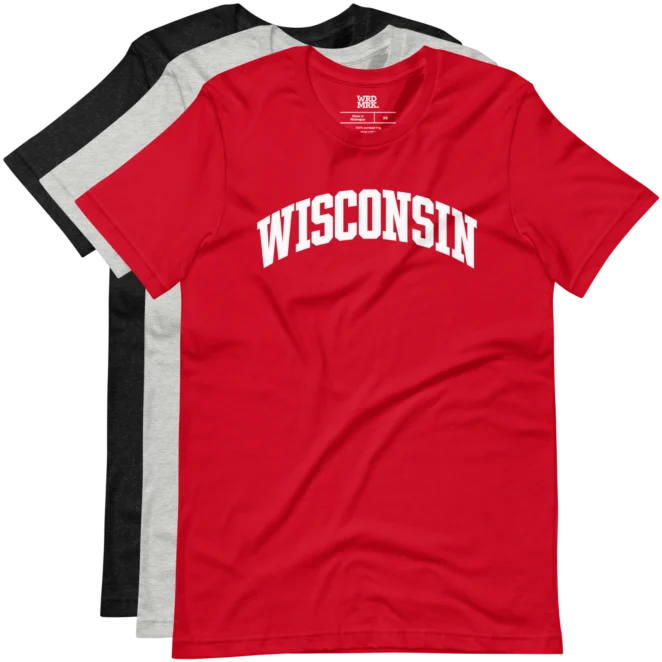 Classic arched block letter Wisconsin typography design printed direct-to-garment on a soft premium tee.