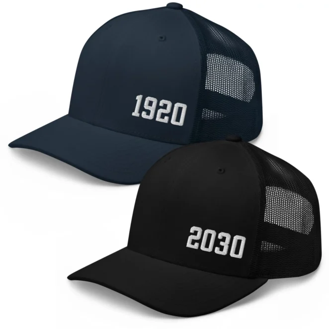 Our most popular low-profile snapback trucker hat with any year from 1920 to 2030 embroidered on the front lower right. Proudly wear your birth year, graduating class, or celebrate the new year. Choose from Navy or Black.